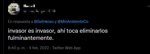 La bioxenofobia se manifiesta del mismo modo: se resaltan las diferencias, se construyen discursos de odio y se promueve la expulsión y el exterminio. En la xenofobia, la amenaza proviene del extranjero —pobre y racializado— porque acapara los empleos, o del extranjero —poderoso— porque “domina” a los locales (Rodríguez et al., 2020). En la bioxenofobia, las especies son señaladas de ser destructoras de los ecosistemas, perjudiciales para la economía o peligrosas para los seres humanos y las especies de las que nos beneficiamos.